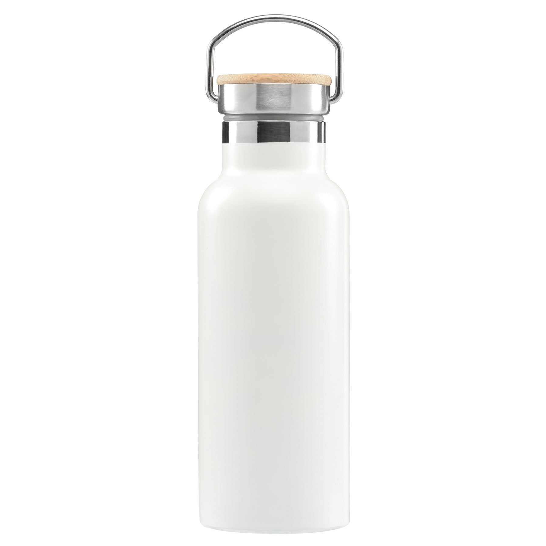 This drinkware items features a stainless steel base, carrying loop, and screw-on lid with a wooden top accent. Made for cold beverages, this vacuum-insulated canteen keeps drinks cold for up to 24 hours. Choose from stainless steel to matte color options and customize with a 1-color silkscreen imprint. CA Prop 65 compliant. BPA free. - NO EQP